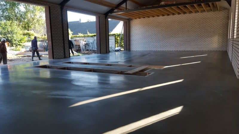 Een veilige en onderhoudsvriendelijke garagevloer van beton. Na het storten is de betonvloer gevlinderd om een mooi glad en strak uiterlijk te krijgen. Door te vlinderen egaliseren we de betonvloer, deze nabewerking zorgt voor een egale afwerking en verdichting van de toplaag. De toplaag kan zich hierdoor goed hechten aan de bulklaag van de betonnen garagevloer.
