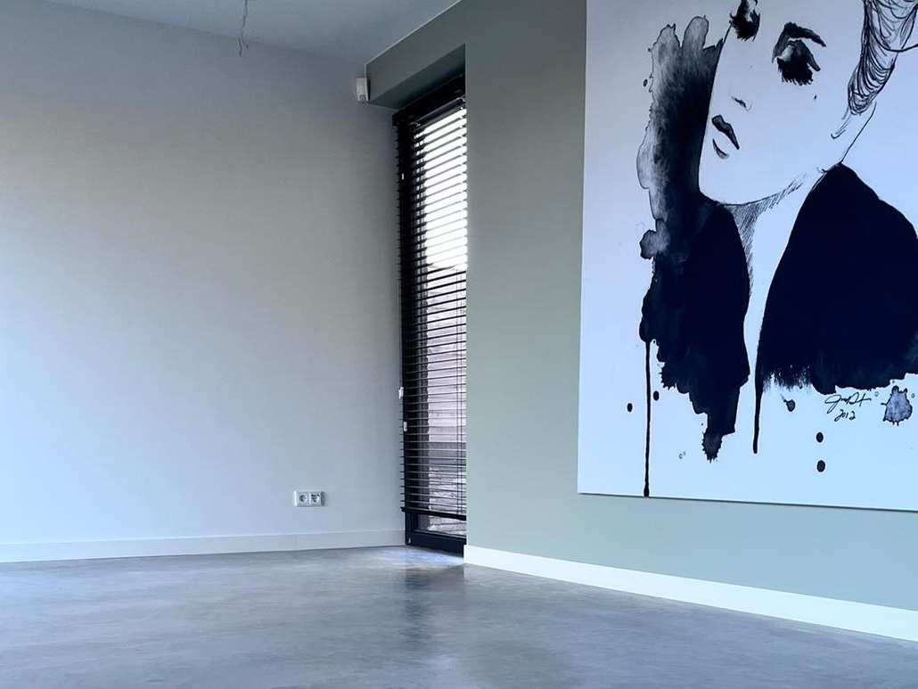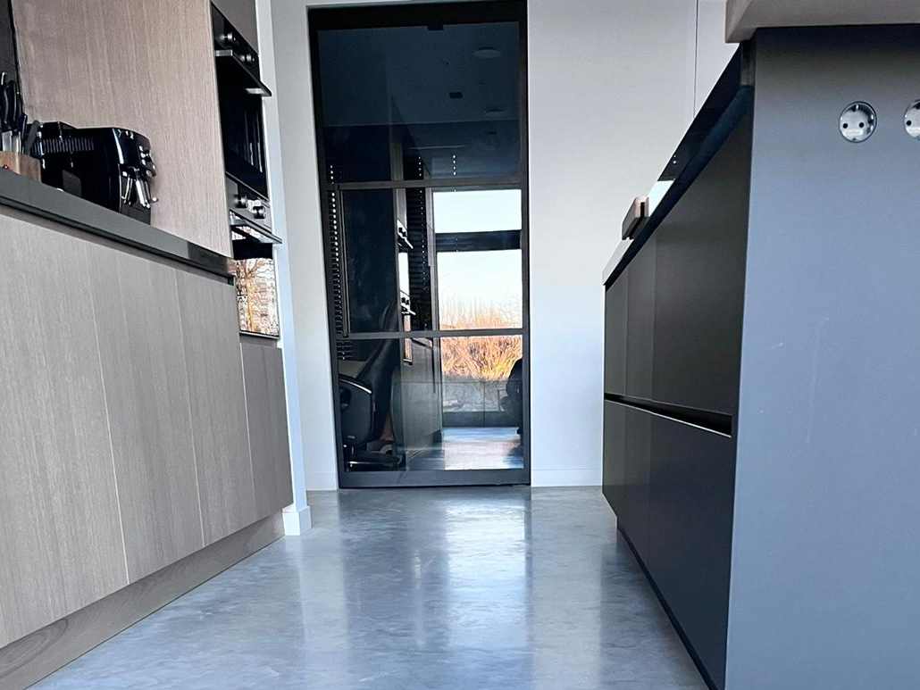 De vloer loopt door in de hele woning en is geheel drempelvrij, dat geeft een mooie en open sfeer. Zeker in combinatie met de glazen deuren. Deze woonbeton vloer is een lust voor het oog en heel praktisch bovendien.