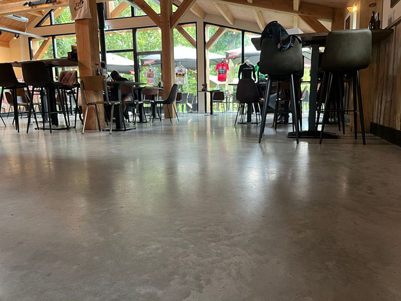 Naast de slijtvastheid van deze woonbeton vloer in Eerde, is de vloer ook nog eens onderhoudsvriendelijk. Niet geheel onbelangrijk in een etablissement waar regelmatig bezoekers met vieze voeten binnenstappen vanwege de ligging middenin de natuur, of waar wel eens een drankje omvalt.