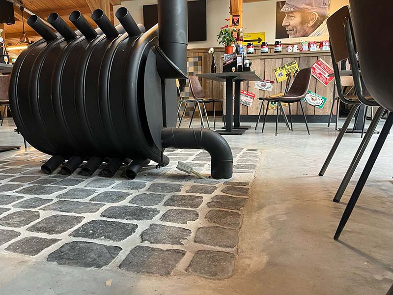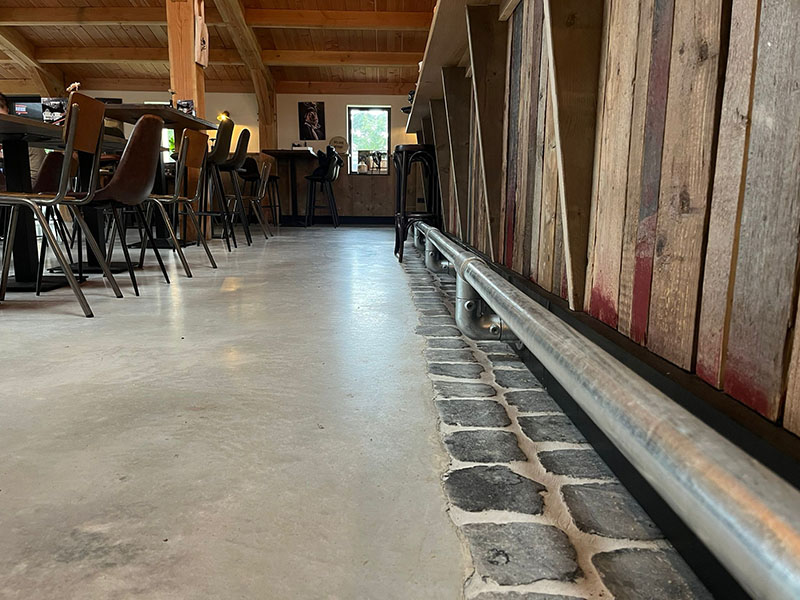 Het is belangrijk dat de vloer hiertegen bestand is, zonder dat hij hierbij inlevert op kwaliteit en uitstraling. Een van de unieke eigenschappen van woonbeton is de slijtvastheid en daarmee een hoge duurzaamheid en lange levensduur. Een ideale keuze dus voor de vloer in dit bekende café in Eerde.