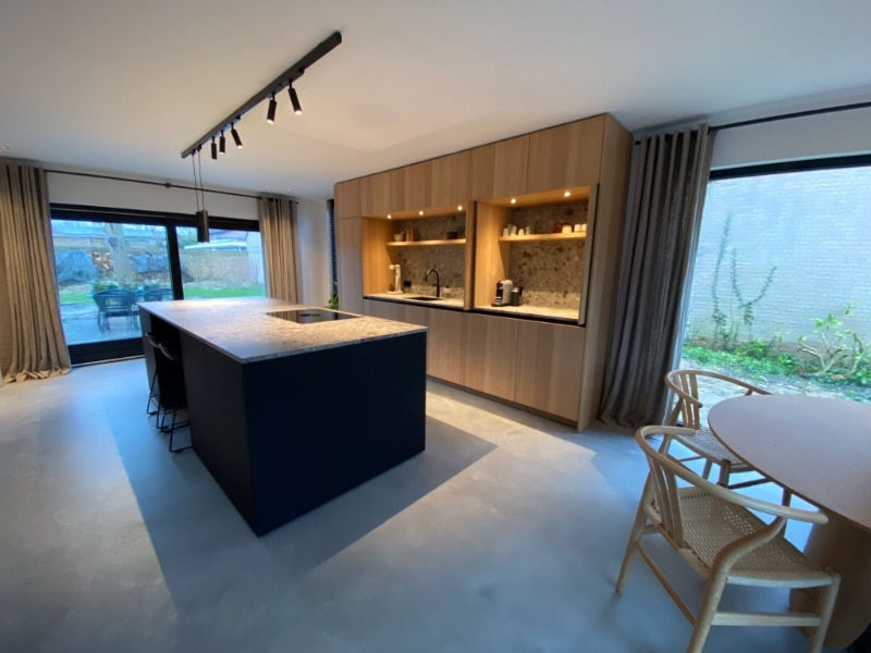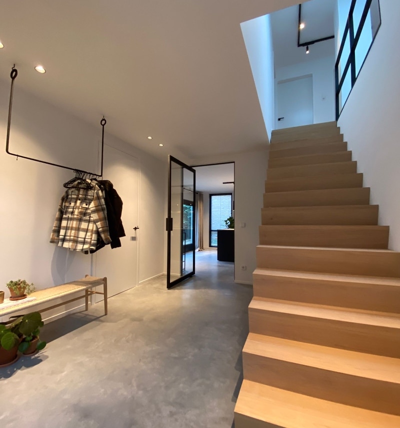 De klant wilde graag samenhang creëren door de woonbeton vloer door te trekken in de gehele woning. Doordat de betonvloer in de woonkamer, hal, keuken én badkamer is gelegd, ontstaat er één geheel zonder drempels. De woning oogt hierdoor een stuk ruimtelijker.